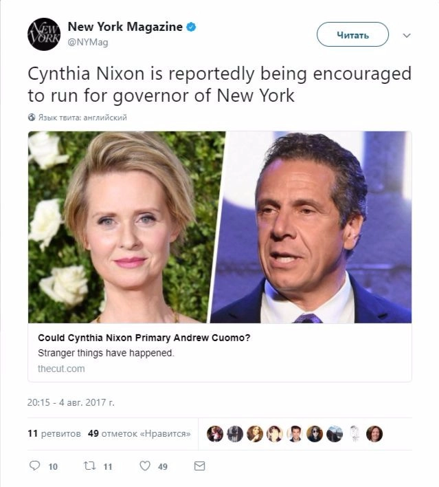 По мнению специалистов, в 2018 году 51-летняя Никсон может составить достойную конкуренцию действующему губернатору штата Эндрю Куомо, который будет баллотироваться на третий срок, сообщает The Cut.