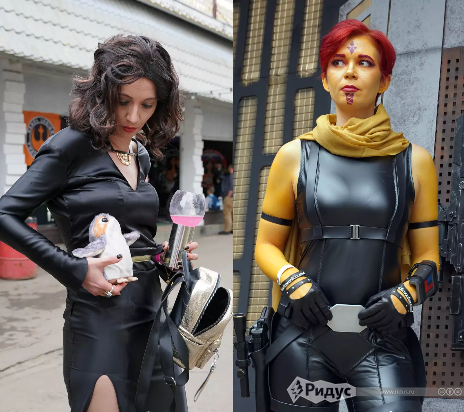 Елена Кириллова слева держит на руках Порга - фантастическую птицу из "VII эпизода: Пробуждение Силы". Справа Риши Ар.
