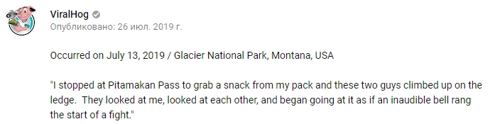 YouTube-канал Viral Hog опубликовал видеозапись, на которой можно наблюдать жестокую схватку двух сурков. Грызуны — герои ролика — устроили кинематографичный поединок на краю глубокой пропасти в американском Национальном парке Глейшер в Скалистых горах, отпихивая друг друга лапами и кусая. Автор предположил, что сурки делили кормовые угодья.